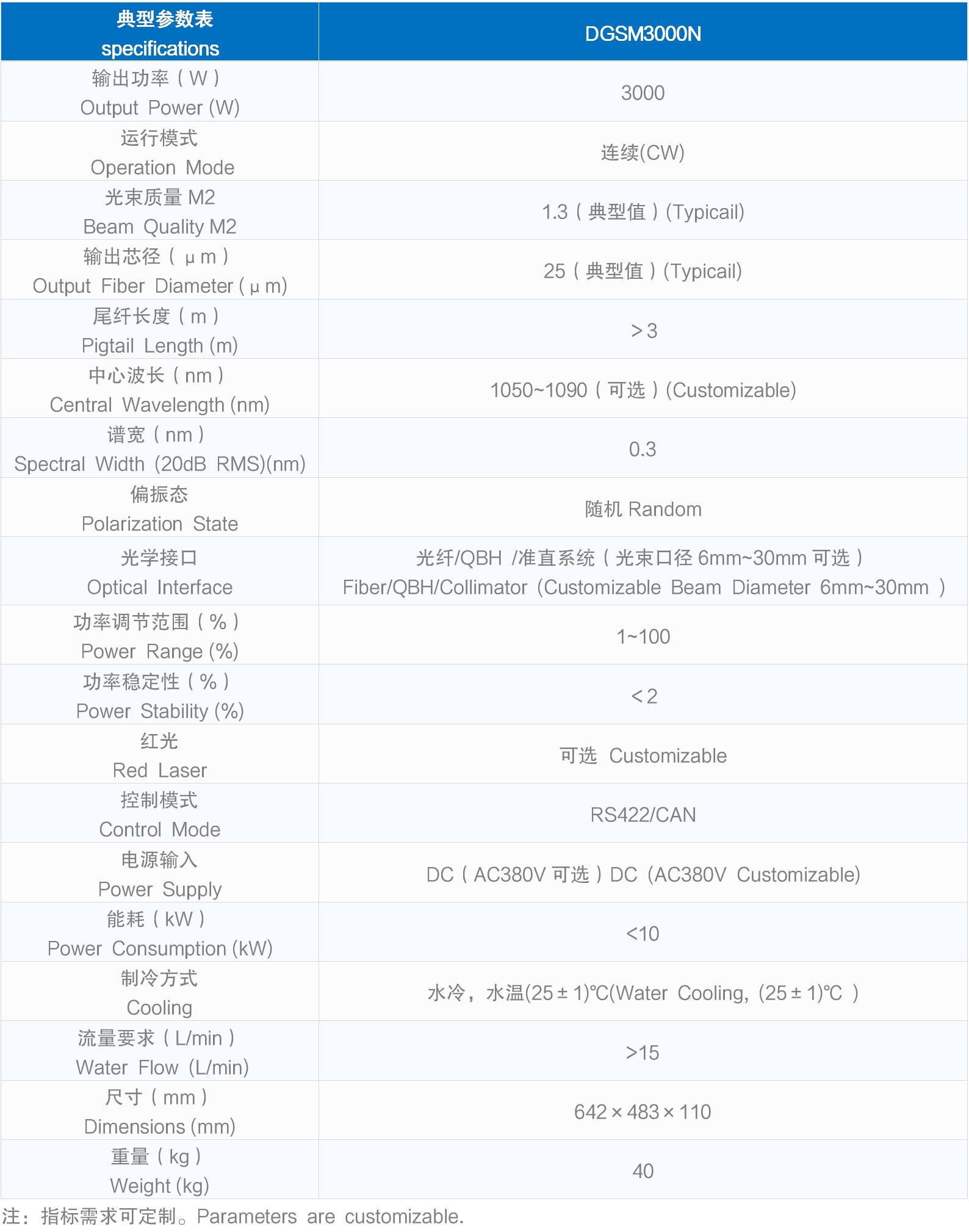 可實(shí)現(xiàn)3kW輸出激光的光譜帶寬(20dBRMS)小于0.3nm,中心波長(zhǎng)1050nm~1090nm可選,中心波長(zhǎng)偏差不大于0.1nm,可滿足光譜合成等應(yīng)用。